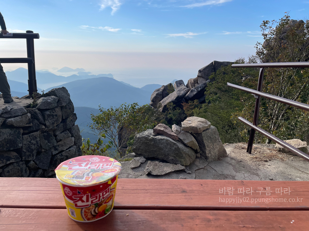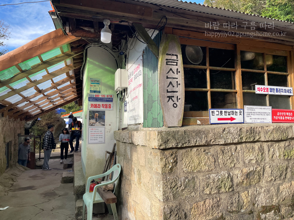 금산산장은 보리암 옆에 있는 산장입니다. 보리암 옆으로 난 길을 표지판을 따라 조금 올라가면 나오는데요. 이곳은 SNS에서 사진 찍기 좋은 곳으로 유명해진 곳입니다. 멀리 바다가 내려다 보이는 산 위에서 컵라면을 먹을 수 있는 곳이기 때문이지요. 할머니가 운영하시는 곳이라서 조금 투박한 느낌이고, 카드는 안 된다는 점 기억해주세요. 그리고 테이블이 몇 개 없어서 자리 싸움이 치열하니 기왕이면 사람 없는 시간에 가시는 것을 추천합니다. 사실 사람 없는 시간에 가도 이곳은 항상 만석이긴 합니다.