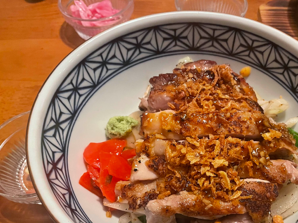 간장 닭구이 덮밥입니다. 닭고기가 촉촉하고 밥에도 간이 잘 배어서 맛있었어요.