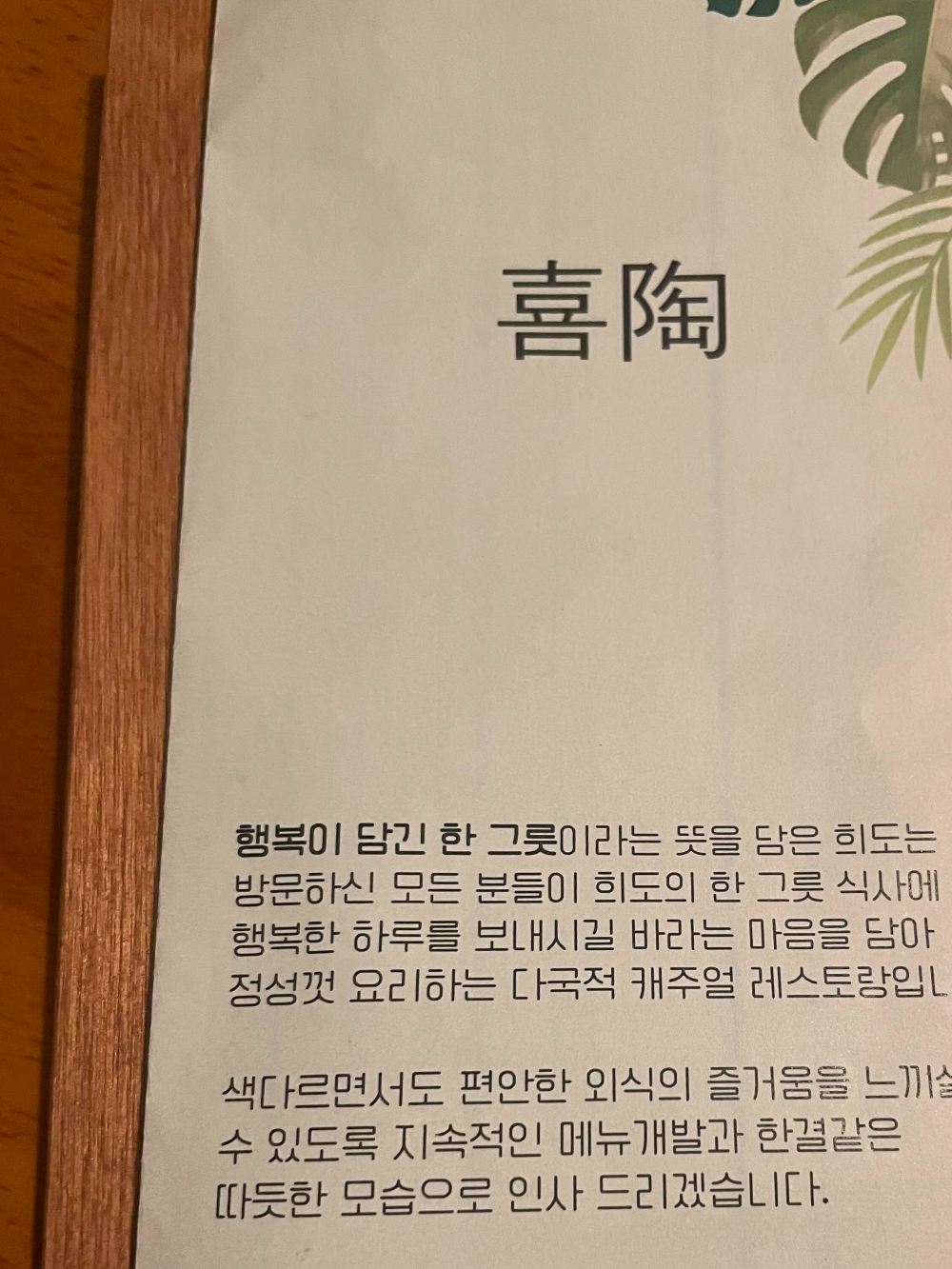 희도 식당의 메뉴입니다. 이곳은 퓨전 음식점이에요. 간장 닭구이 덮밥과 토마토 소고기 탕면을 주문했어요.