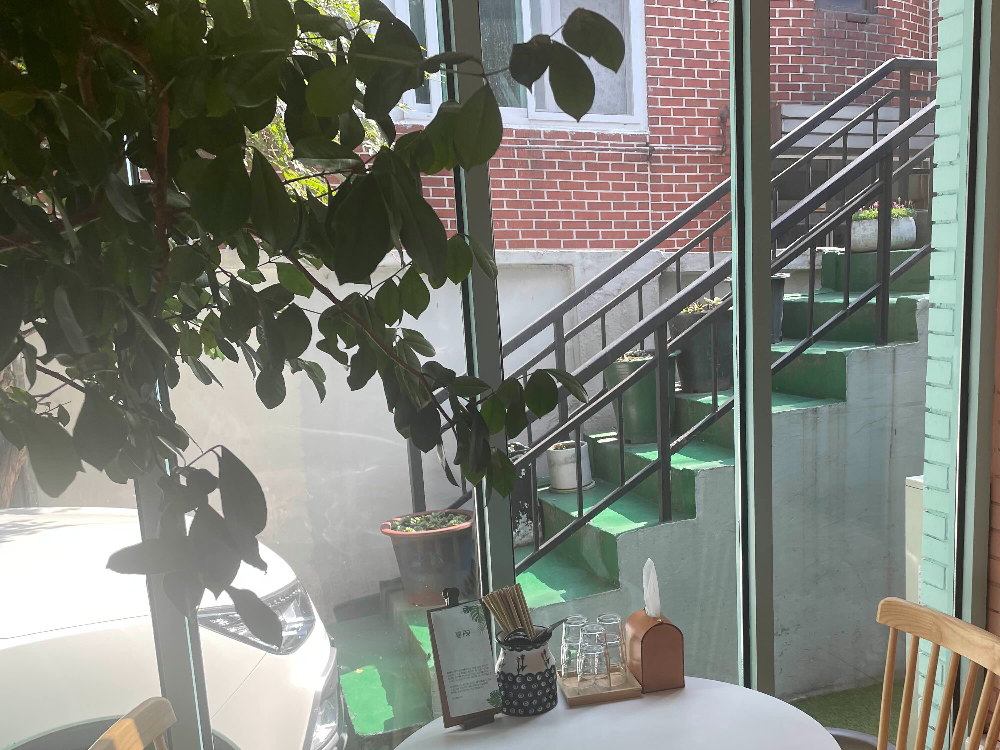 출입문 바로 옆에도 자리가 있어요. 야외 느낌이 나서 좋을 수도 있지만, 가정집 계단 뷰라서 좀 애매하네요.
