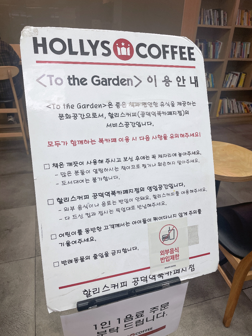 1인 1음료 주문, 외부 음식 금지예요. 아무래도 공간이 크다 보니 외부 음식을 가지고 오는 사람이 있을 듯하네요.