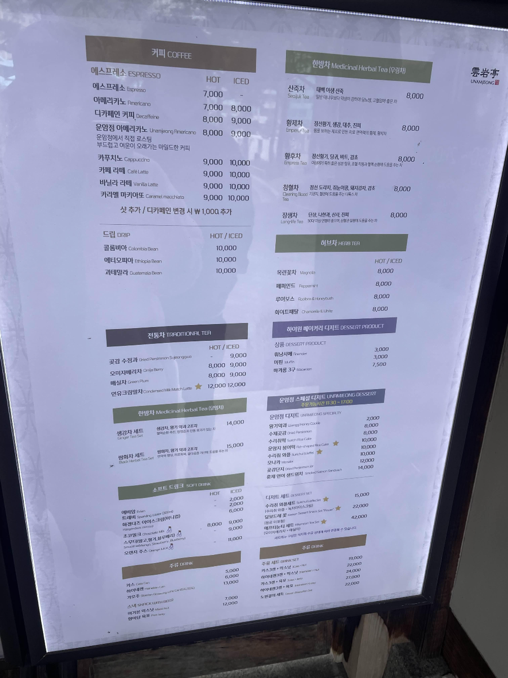운암정 카페 메뉴판입니다. 역시나 가격은 저렴하지 않았어요.