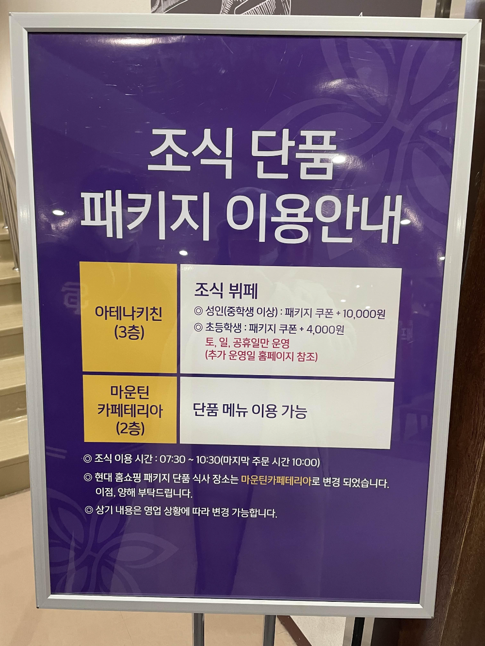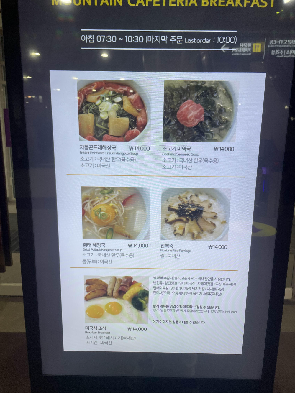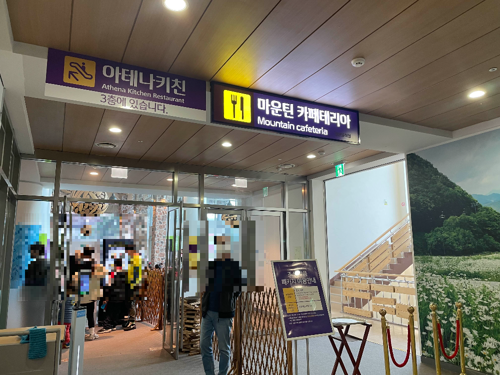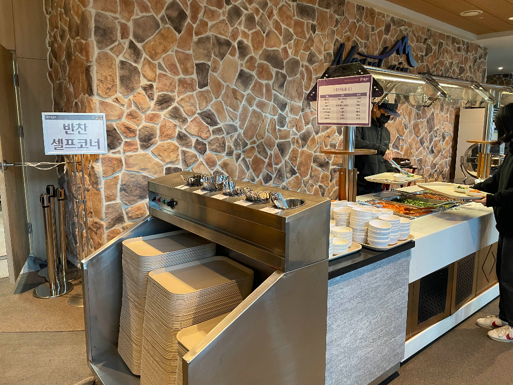 패키지로 구입한 사람은 스키하우스 2층 마운틴 카페테리아에서 조식을 먹을 수 있는데요. 성인은 만 원, 초등학생은 4천 원을 더 내면 3층 아테나키친의 뷔페로 업그레이드할 수 있어요. 사실 뷔페로 바꿔서 먹을 작정이었는데, 하필 남편이 장염에 걸리는 바람에 그냥 간단히 단품 메뉴를 먹기로 했습니다.