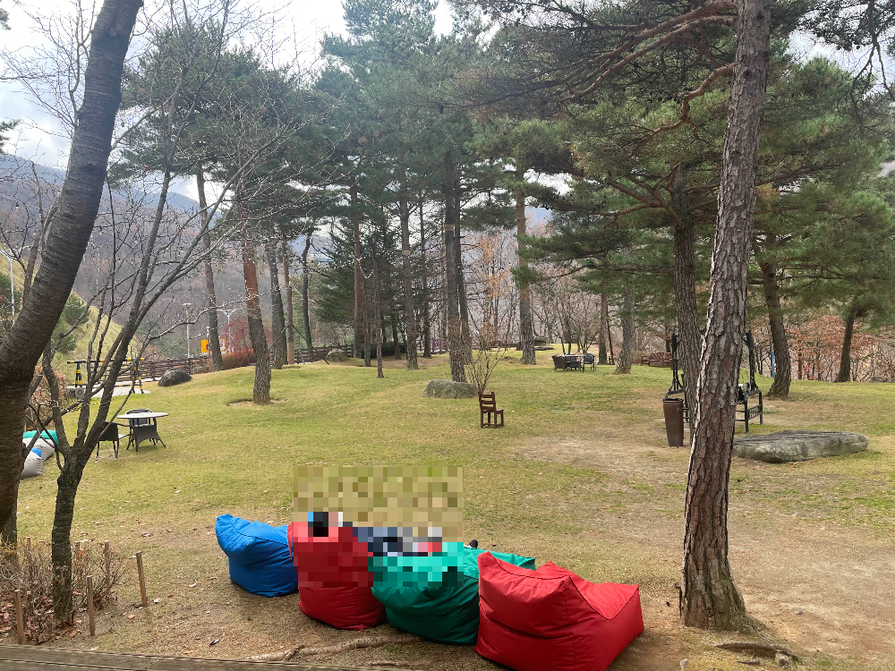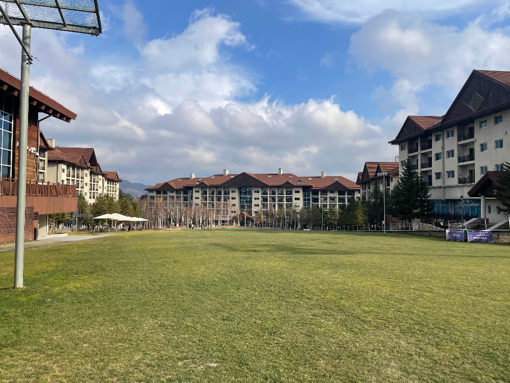 아침에 조식을 먹으러 스키하우스로 올라갔습니다. 앞에 잔디밭이 넓게 펼쳐져 있어요. 겨울에는 스키장이 되겠네요. 잔디밭에 농구 골대와 축구 골대도 있어요. 혹시 공놀이를 좋아하는 아이가 있다면 공 하나 챙겨오시는 것을 추천합니다.