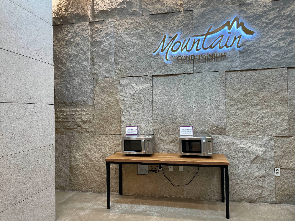 마운틴콘도 F동에서 1층으로 내려가면 전자레인지를 쓸 수 있고, G동 쪽으로 가면 편의점이 있어요. 편의점에 음식 종류가 굉장히 많아서 이것저것 사다 먹을 수 있는 것이 좋았습니다. 금요일이라서 그런 것인지는 모르겠지만, 음식점이 문을 안 열어서 배달시켜서 먹었는데요. 콘도 안에 배달 책자도 있고, 배달앱으로도 배달주문이 가능했어요. 가게에 따라 콘도 앞까지 배달기사님이 올라오는 곳도 있고, 주차장에 받으러 가야 하는 곳도 있어요. 대신 시켜야 하는 최소 금액이 조금 큰 편이더라고요. 치킨 같은 경우에는 2마리부터 시켜야 하는 경우가 많았고 배달비도 약간 비싼 편이었어요. 그래도 배달시킬 수 있는 음식이 다양해서 편리하고 좋았어요.