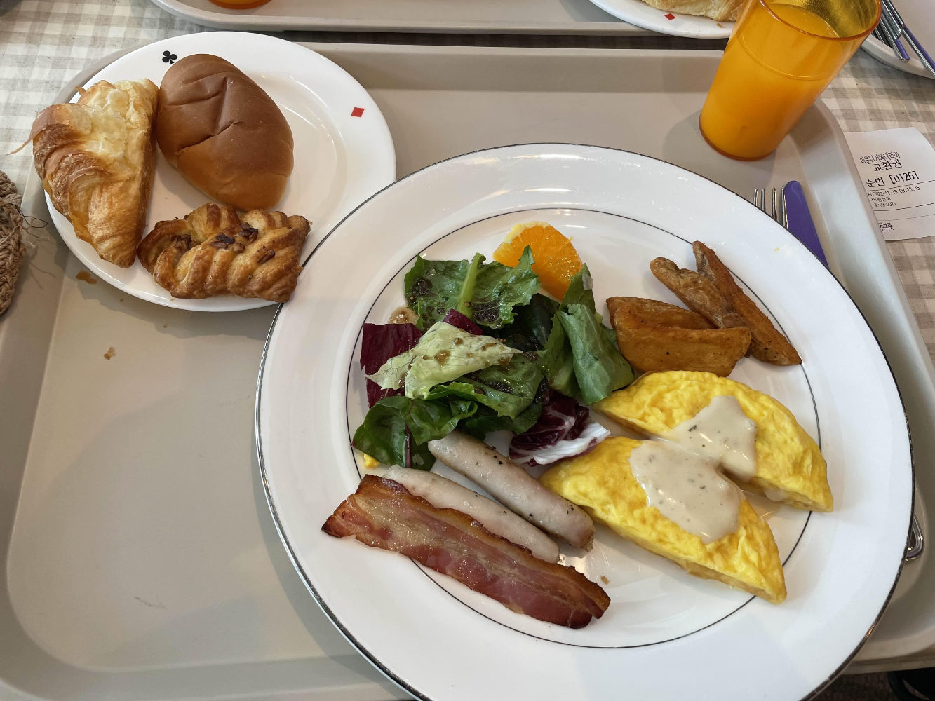 마운틴 카페테리아로 입장해서 카운터에서 티켓을 확인하고 메뉴를 고르면 되는데요. 배아픈 남편은 전복죽, 저랑 아이는 미국식 조식을 골랐습니다. 반찬을 셀프로 가져다 먹을 수 있는 코너도 있는데, 돈까스 하나에 어찌나 사람이 몰리던지... 맛이 있는 것도 아닌데 좀 그랬어요.
