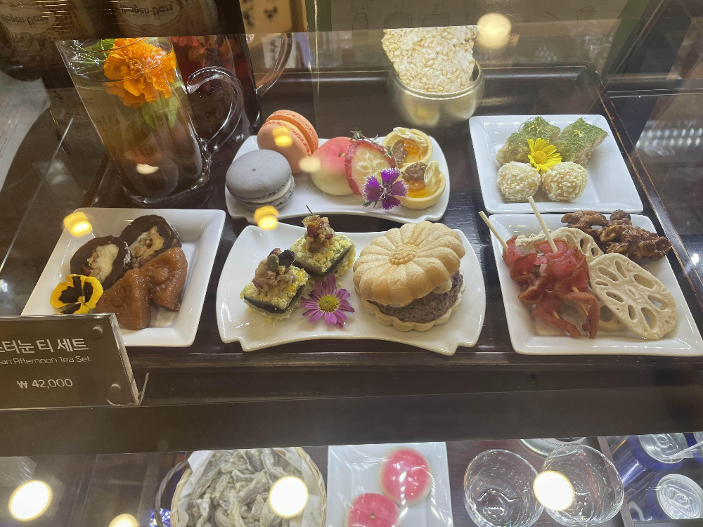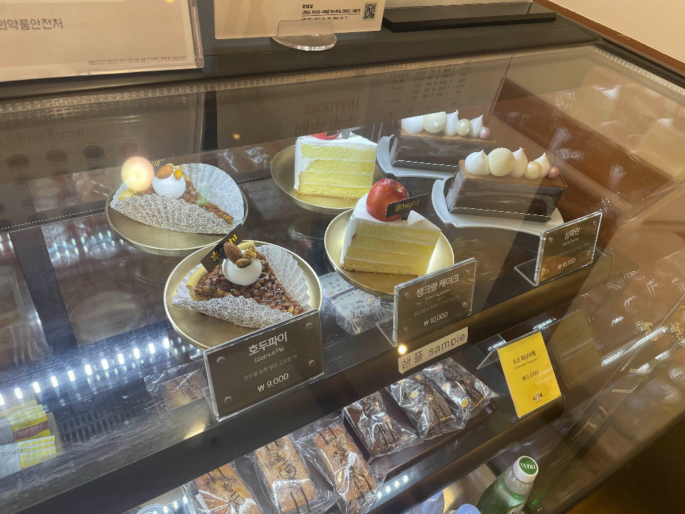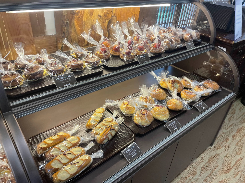 운암정 메뉴는 키오스크로 주문해도 되는데, 저는 할인권을 쓰기 위해 직원에게 가서 결제했습니다. 일단 자리부터 잡으려고 내부를 둘러보니 생각보다 안쪽으로 자리가 꽤 있었어요. 한옥 카페다 보니 떡이나 약과 같은 간식도 있었는데 가격이 다 상당하더라고요. 그냥 적당한 가격의 베이커리를 골랐습니다.