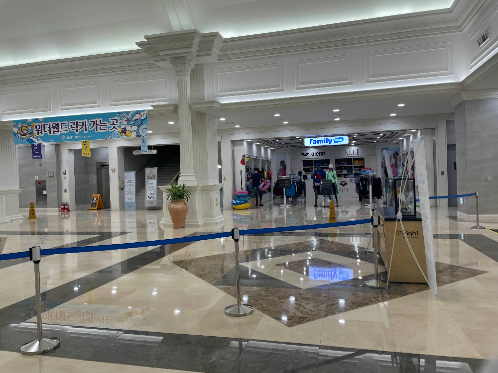 깔끔한 워터월드 입구. 참고로 이곳은 수건을 지급해주지 않아서 꼭 챙겨가야 해요. 아니면 한 장에 1000원을 내고 대여해야 합니다. 우리는 수건이 한 장밖에 없어서 1000원을 내고 빌렸어요. 흑