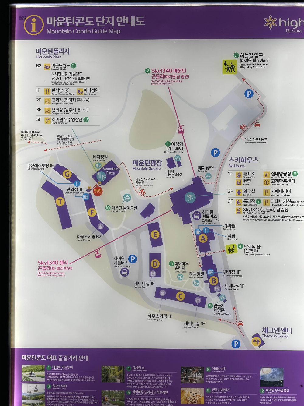 마운틴콘도 배치도입니다. 하이원리조트는 워낙 넓은데다가 내부도 복잡해서 헤매기 딱 좋게 생겼더라고요. 부대시설(오락실, 노래방 등)은 F동과 G동 사이에 있는 마운틴플라자에 있고, 언덕 위로 좀 올라가면 있는 스키하우스에 양궁장, 롤러장, 조식 먹는 곳, 곤돌라가 있어요. G동에 편의점이 있어서 편하게 이용했습니다.