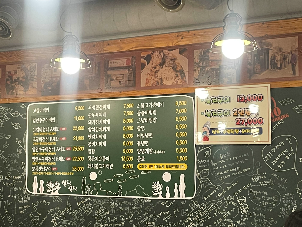 노원 털보고된이의 영업시간은 오전 11:00부터 오후 9:00까지예요. 평일 낮 영업시간에 거의 딱 맞춰서 갔는데 우리가 1등이었어요. 저는 털보고된이를 가면 항상 삼치구이를 먹는데, 몇 달만에 갔더니 삼치 가격이 많이 올랐더라고요. 흑흑 요즘 삼치가 잘 안 잡히는 건가... 잘 모르겠지만 어쨌든 삼치가 비싸져서 고갈비 정식으로 시켰어요.