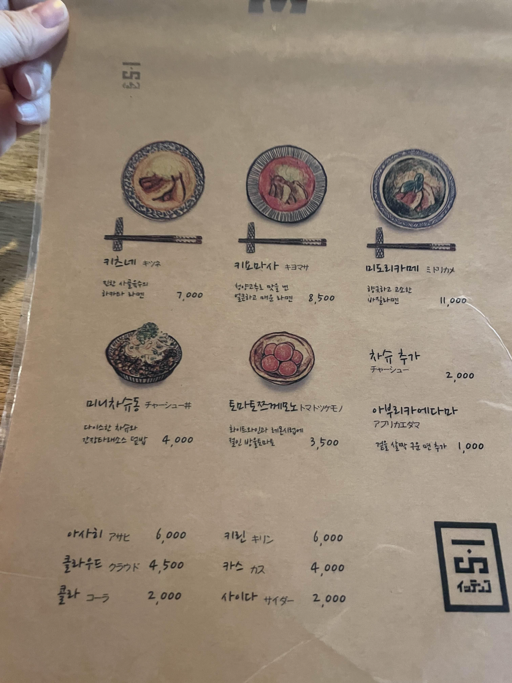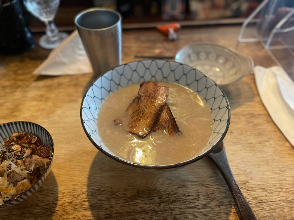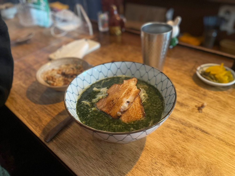 잇텐고는 미도리카메라는 바질라멘이 대표 메뉴라고 하는데, 바질라멘은 제 취향이 아니라서 항상 키츠네 라멘을 먹게 되네요. 저는 키츠네, 친구는 미도리카메를 선택했고, 미니 차슈동을 하나 더 시켰어요. 가게가 워낙 좁은 편인데다가 바 형태로 되어 있어서 여러 명이 오기에는 불편할 듯합니다. 혼자 식사하는 사람도 꽤 많았어요.