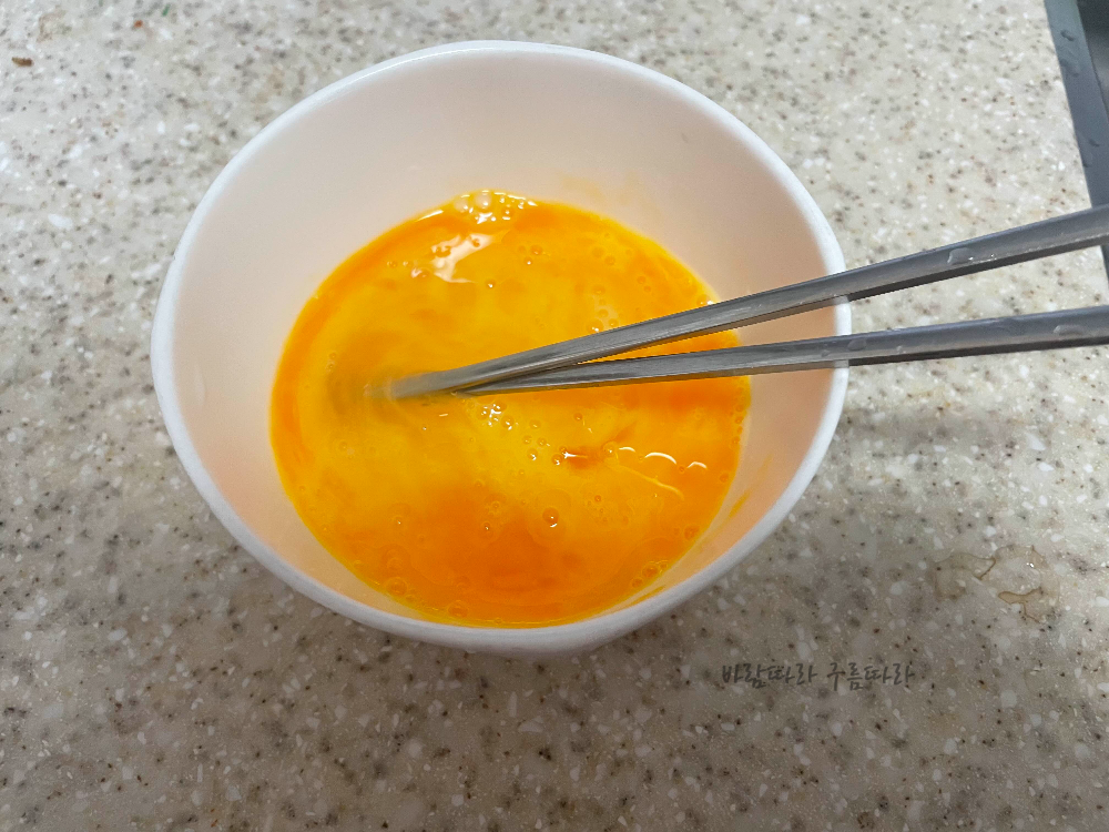 두부를 준비하면서 계란 두 개도 미리 풀어둡니다.