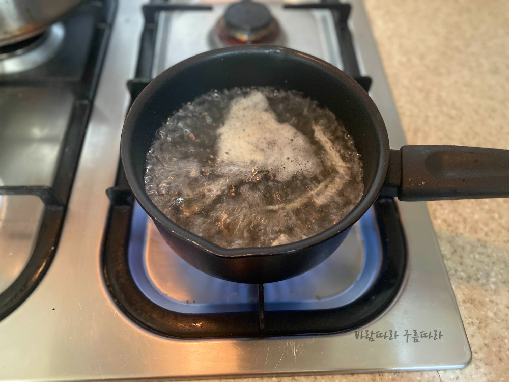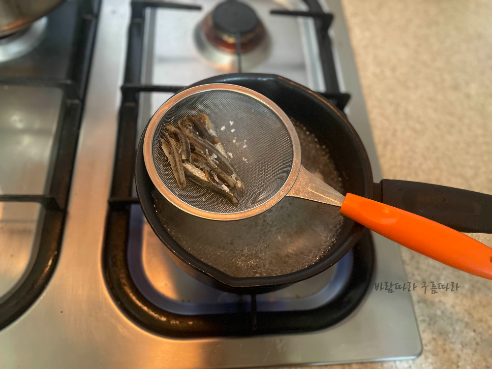 10분 정도 끓인 멸치를 건져내어 버립니다. 그리고 풀어둔 계란을 휘휘 저어서 둘러주듯이 육수에 넣어줍니다. 넣자마자 휘저으면 계란이 풀어져 버리는데요. 각자 스타일에 따라서 계란을 풀어줘도 되고, 조금 덩어리 있는 느낌을 원하면 조금 익은 다음에 저어주면 됩니다. 저는 계란이 너무 풀어지지 않도록 계란을 넣고 조금 후에 저어주었습니다.
