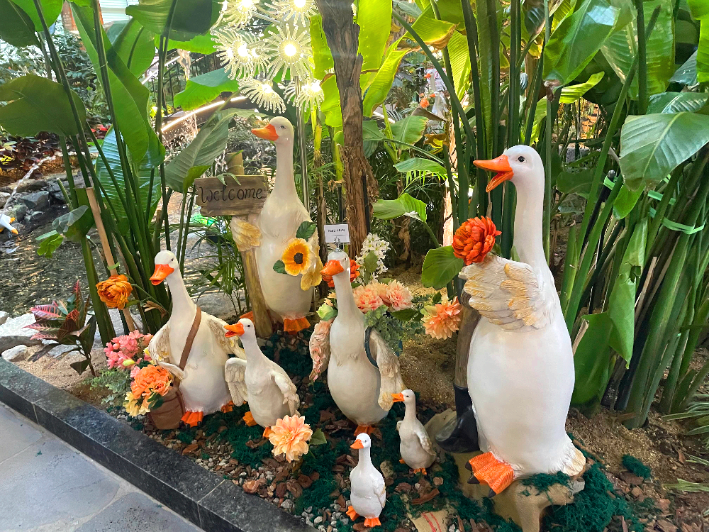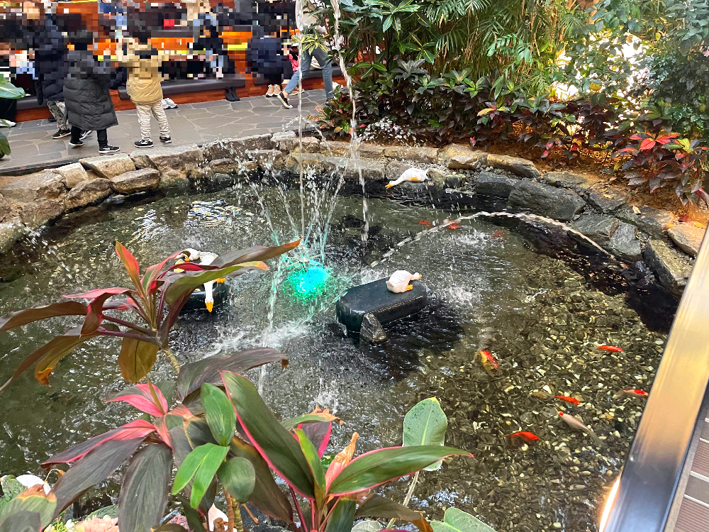 카페 중앙에 연못이 있고, 건너갈 수 있는 다리도 있어요. 연못에 물고기가 살아서 아이들이 구경을 많이 합니다. 갓난아이를 안고 오는 집도 많았어요.