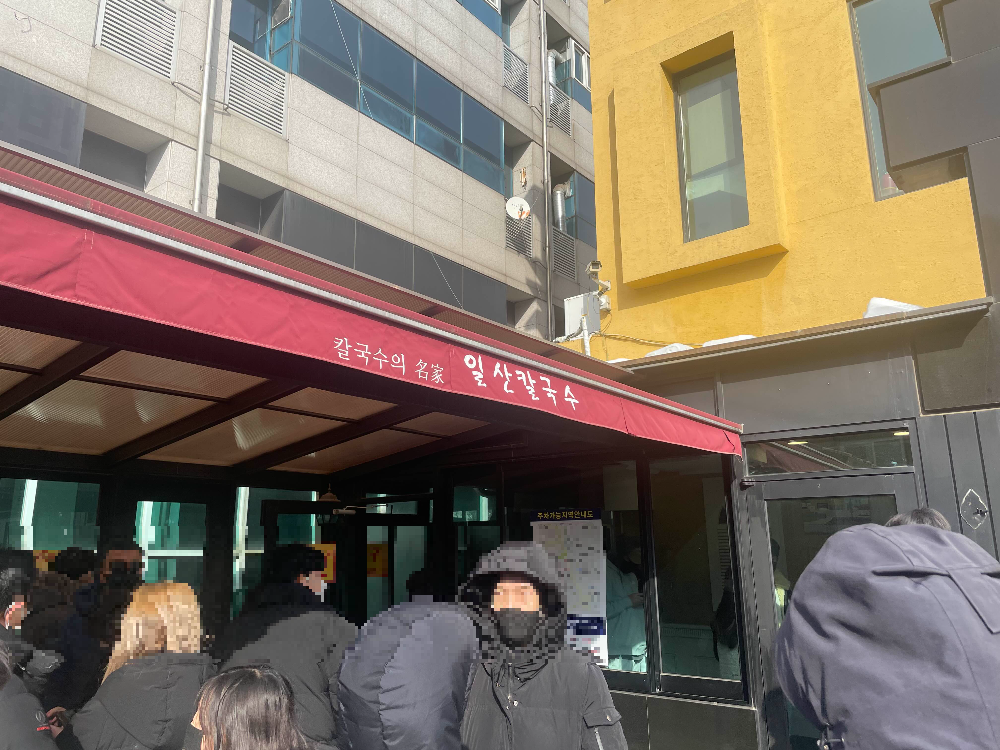 여기까지 왔는데 그냥 돌아갈 수가 없어서 줄을 섰어요. 그래도 생각보다 줄이 빨리 빠지는 느낌이었어요. 아무래도 회전율이 빠른 집이라서 정말 사람이 많았는데도 40~50분 정도 걸린 듯합니다. 역시나 일산칼국수는 피크 시간대는 피해야 와야 한다는 것을 다시금 느꼈습니다.