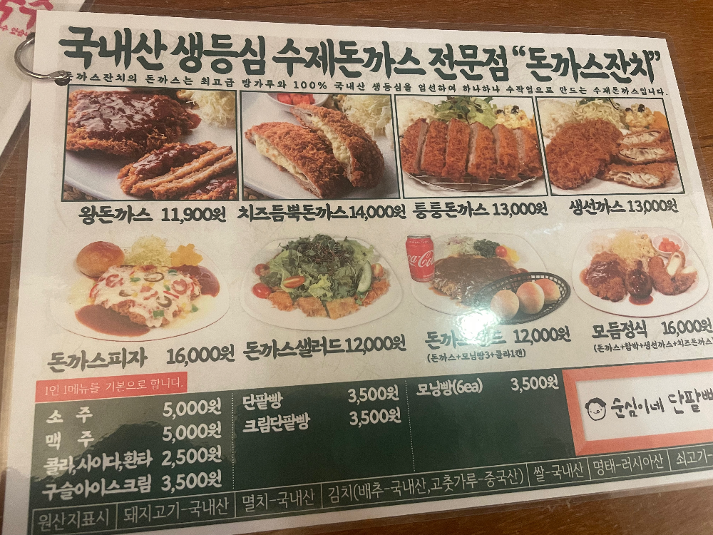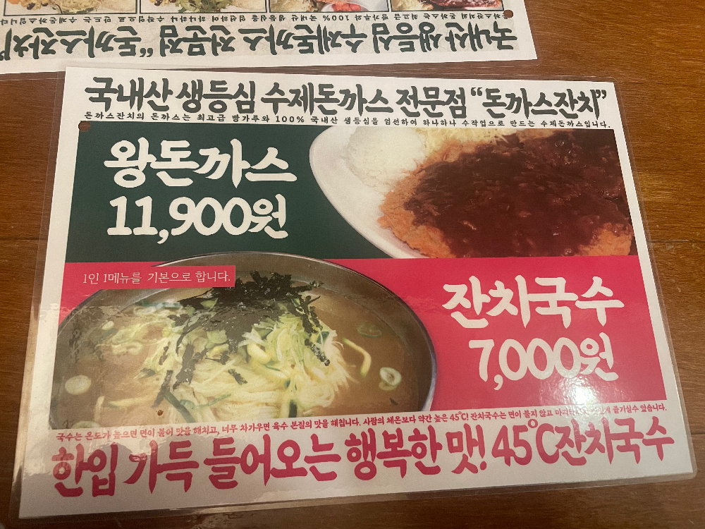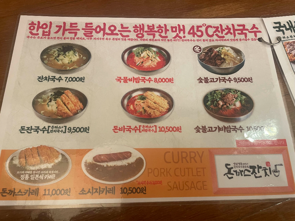 돈까스잔치의 메뉴판입니다. 이곳은 돈까스잔치라는 이름답게 돈까스와 잔치국수가 주 메뉴에요. 그리고 특징적인 것이 돈잔국수, 돈비국수처럼 국수에 돈까스를 얹은 메뉴가 있다는 것인데요. 개인적으로 비빔국수에 돈까스가 얹혀서 나오는 돈비국수는 맛있는데, 잔치국수에 돈까스가 얹혀 나오는 것은 좀 별로였어요. 잔치국수 따로, 돈까스 따로 시키는 게 더 맛있는 것 같아요.