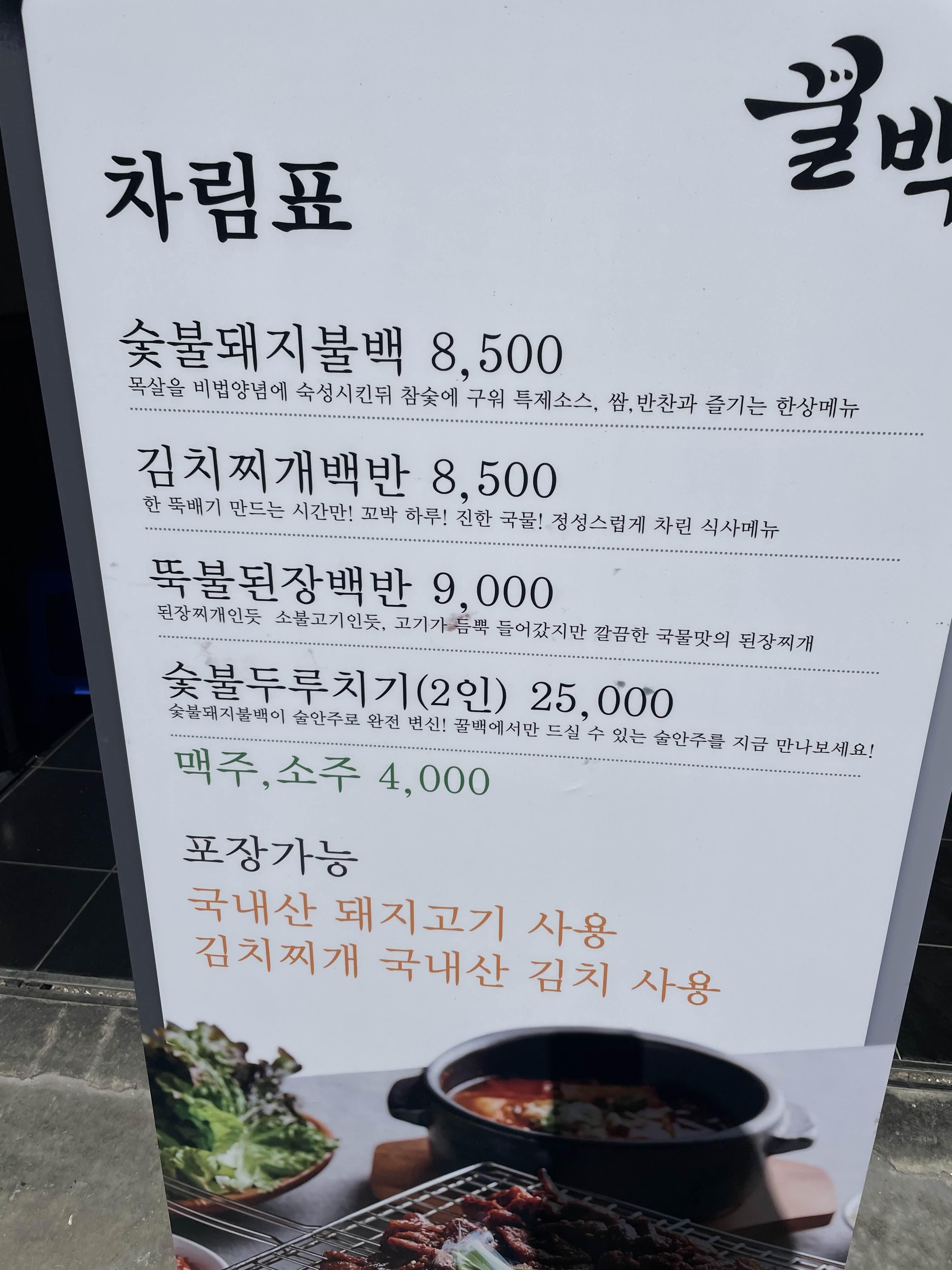 꿀백의 메뉴는 간단합니다. 돼지불백, 김치찌개백반, 뚝불된장백반, 이렇게 있습니다. 그리고 중요한 건 돈을 내고 고기 추가가 가능하다는 사실입니다. 고기가 부족하면 마음 상하기 때문에 무조건 추가해야지요.