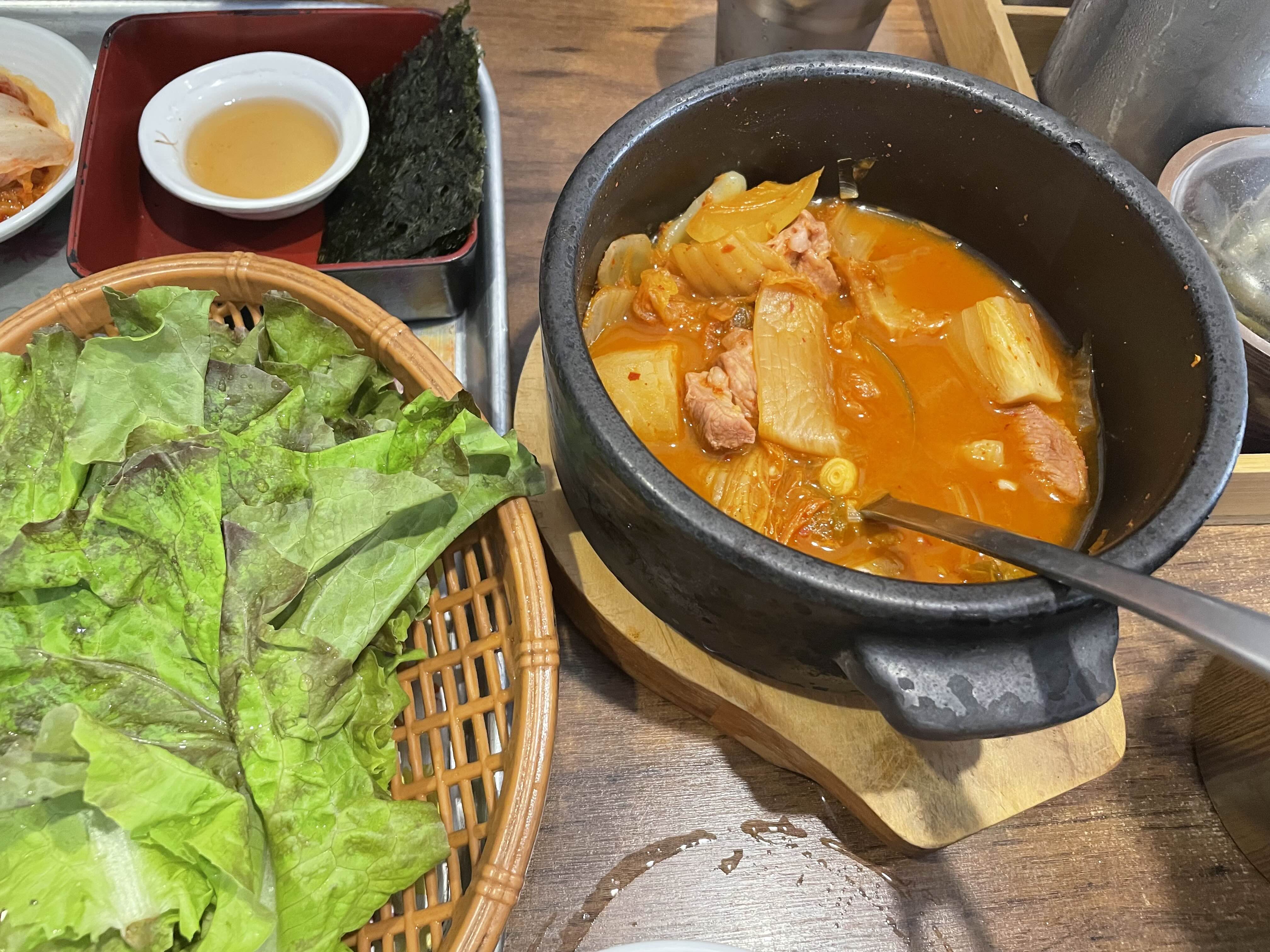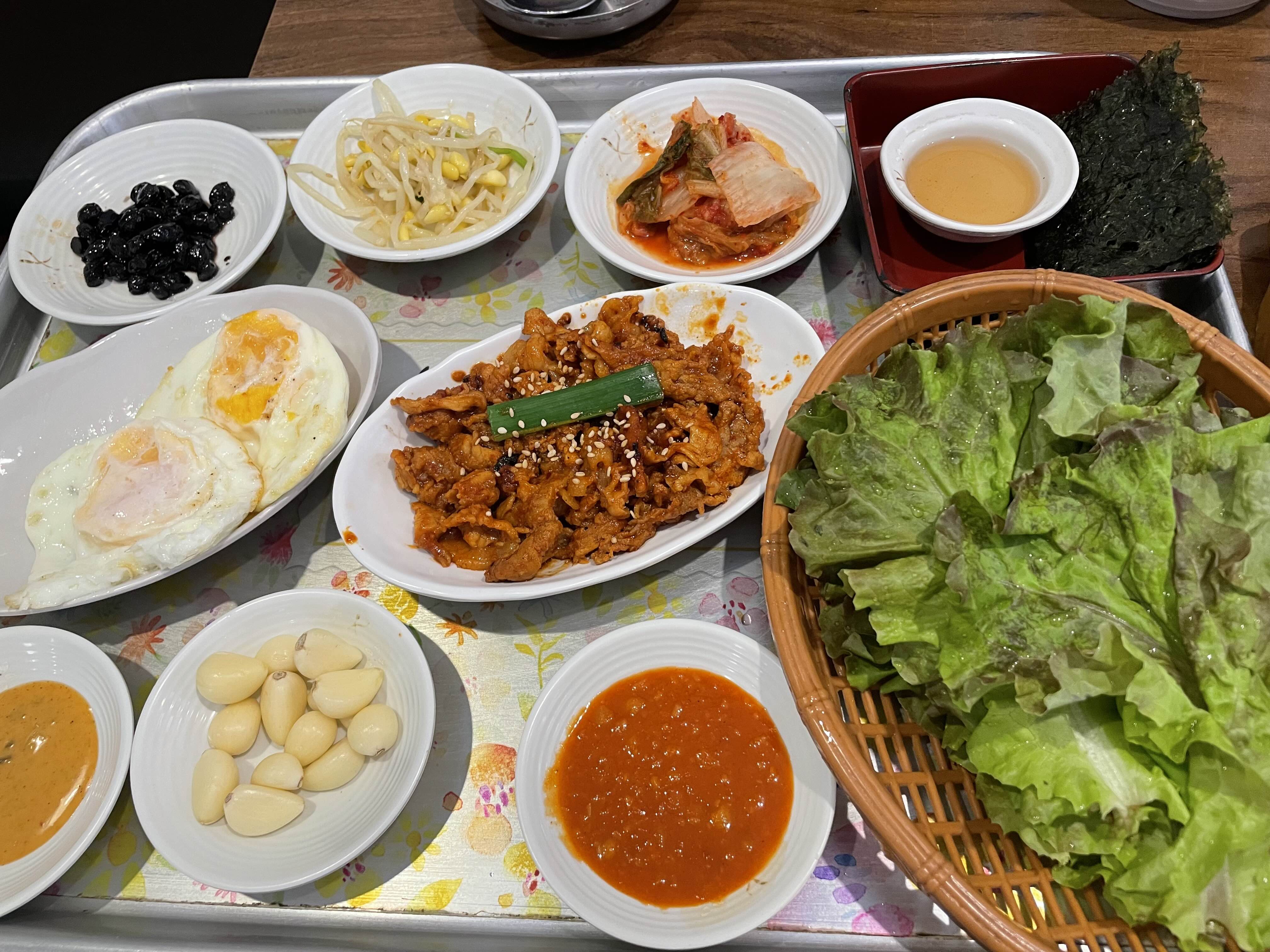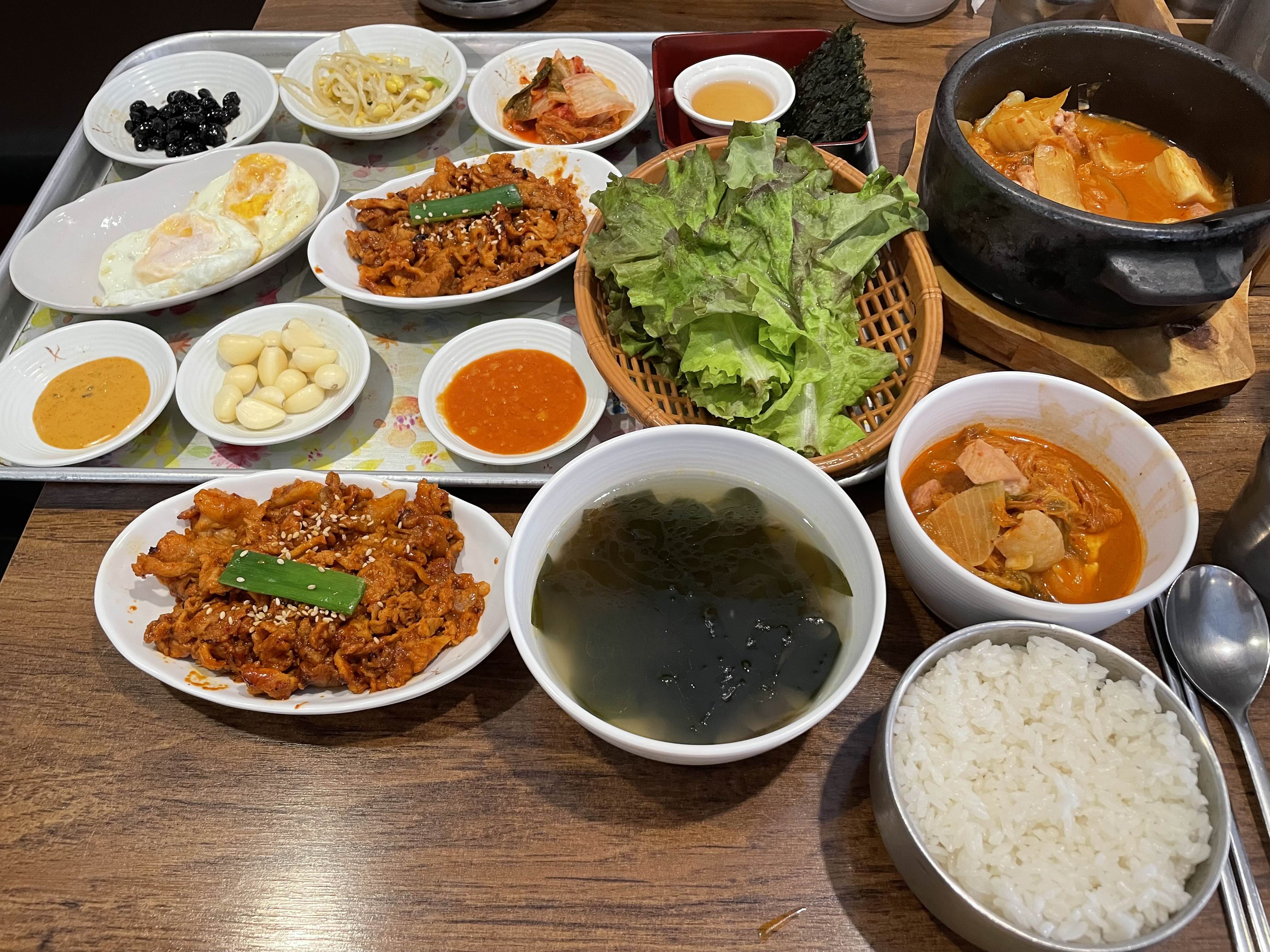 먹성 좋은 저는 친구랑 둘이 가서 숯불돼지백반 하나에 고기 추가, 그리고 김치찌개를 시킵니다. 이게 제 입맛에는 아주 딱 맞아요. 고기 추가를 하면 양이 좀 많아지긴 하지만 여기만 오면 양보다 넘치게 먹게 되네요.