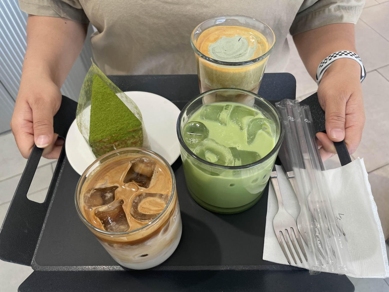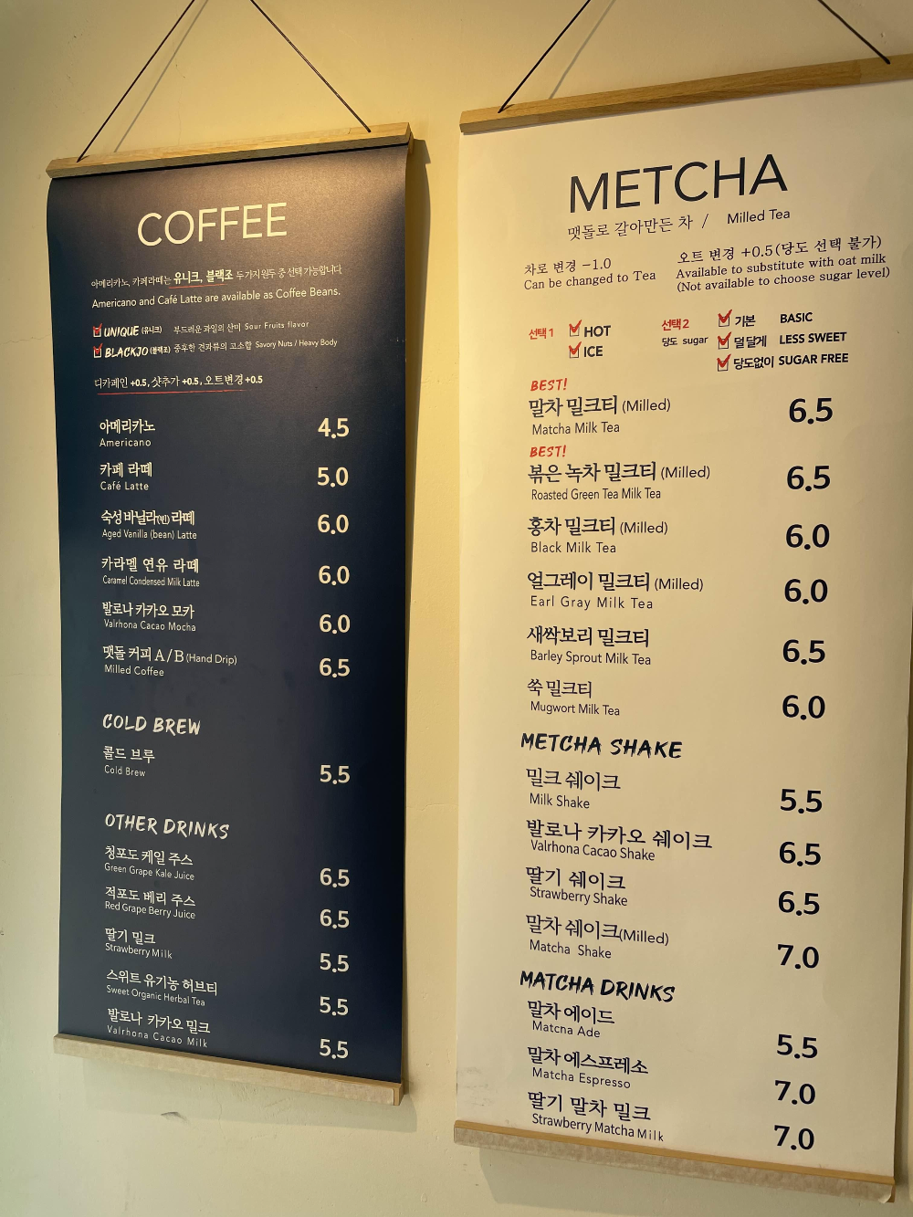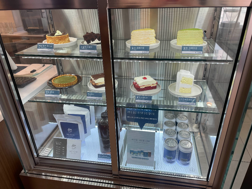 맷차 커피 메뉴판입니다. 다양한 메뉴가 있는데 이곳의 주력 상품은 맷돌로 갈아만든 차인 것 같아요. BEST라고 찍혀 있으니 자연스럽게 시선이 가네요. 커피 외에도 말차와 밀크티로 만든 다양한 메뉴가 있어요. 다양하게 먹어보려고 바닐라빈라떼, 쑥밀크티, 말차밀크티를 골랐어요. 케이크 종류도 다양하게 있어서 말차 크레이프를 골랐습니다.