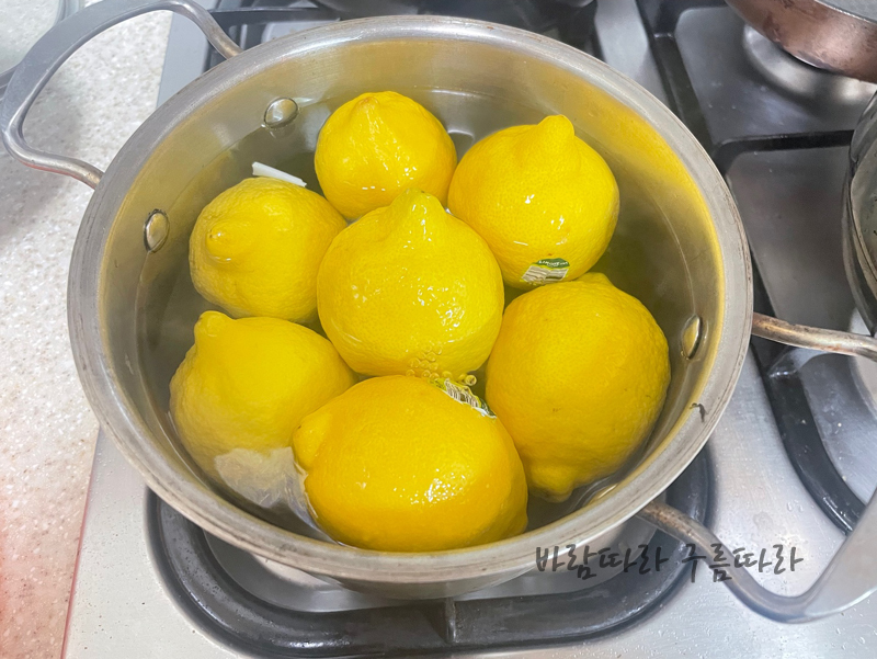 3. 레몬청은 레몬 세척이 가장 큰 일인데요. 국산이 아닌 레몬은 겉에 왁스가 발라져 있어서 제거를 해줘야 한다고 해요. 레몬 세척법은 사람마다 조금씩 다른데요. 저는 먼저 레몬을 뜨거운 물에 살짝 담갔다가 빼주는 일부터 시작했어요.