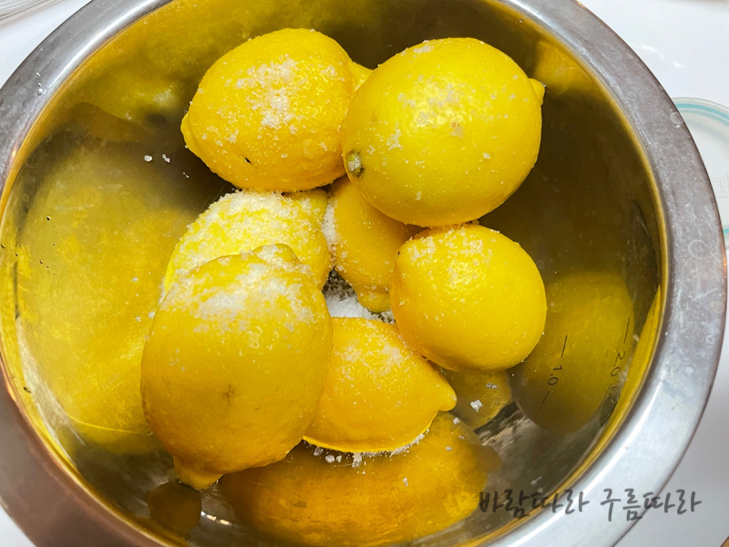 4. 그리고 레몬 표면을 굵은 소금으로 박박 문질러서 닦아 줍니다. 레몬 표면이 거칠거칠 할수록 왁스가 잘 안 닦이는 것 같더라고요. 꼼꼼히 문질러 준 다음 물로 헹구어 줍니다.