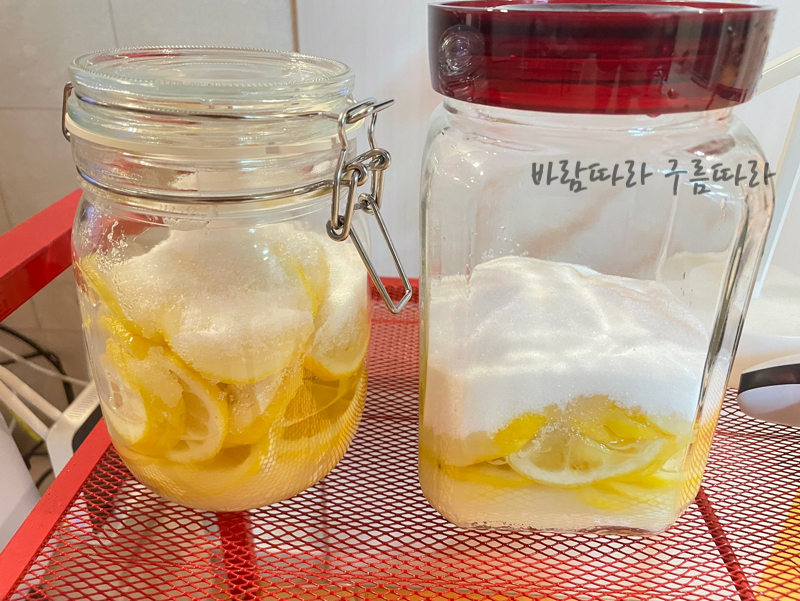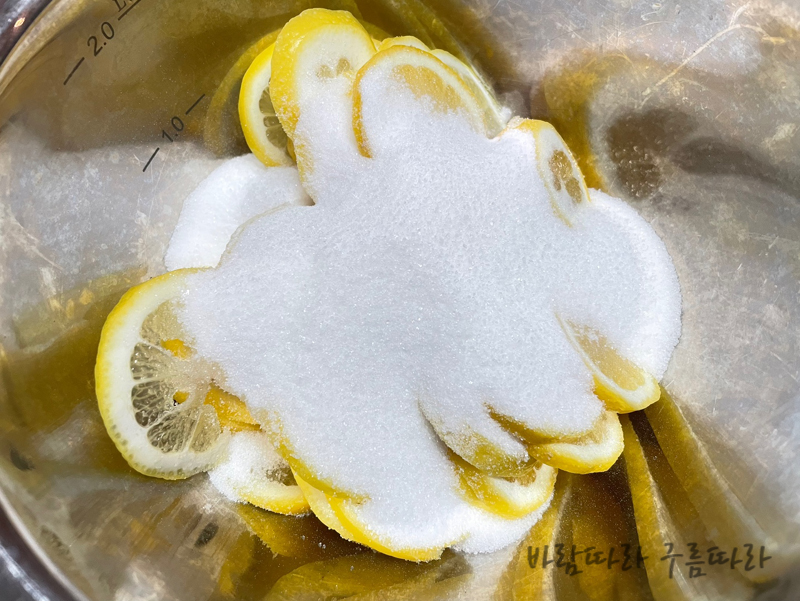 8. 유리병이 두 개라서 400g씩 나누어 만들었어요. 400g의 설탕에서 반 정도를 썰어놓은 레몬에 넣고 잘 섞이도록 뒤섞어주었습니다. 그리고 남은 설탕에서 반 정도는 유리병에 깔고, 그 위에 설탕과 잘 버무린 레몬을 넣은 다음, 나머지 설탕으로 위를 덮어주었어요. 그대로 뚜겅을 덮으면 완성입니다.
