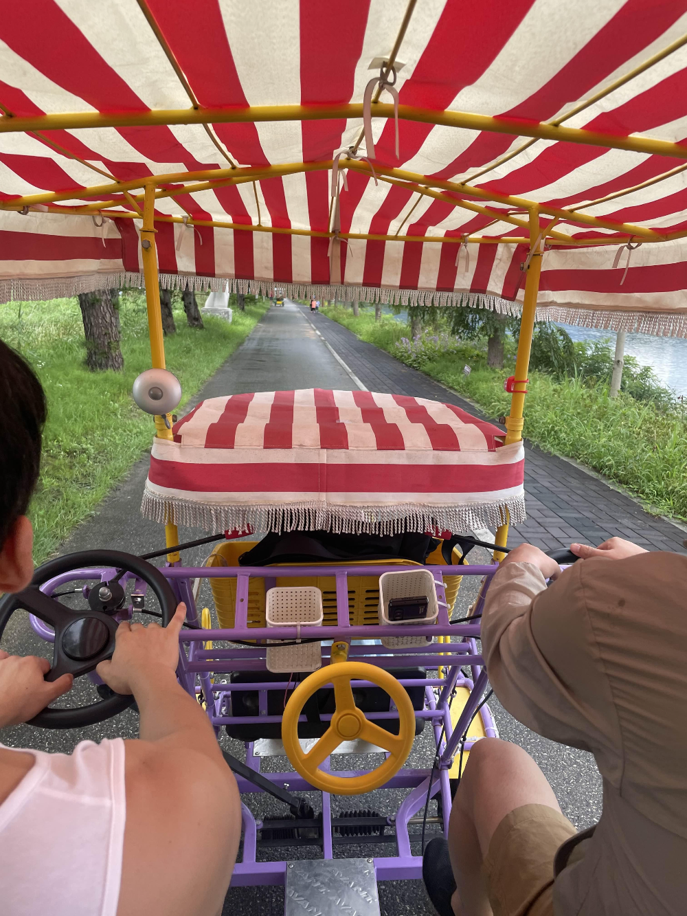 경포대에는 바다 말고도 경포호라는 호수가 있습니다. 크기가 상당히 큰 호수인데요. 산책하기도 좋고, 자전거 타기에도 좋은 곳입니다. 주변에 가면 자전거를 대여해주는데, 여러 명이 탈 수 있는 단체 자전거를 빌려서 탔어요.