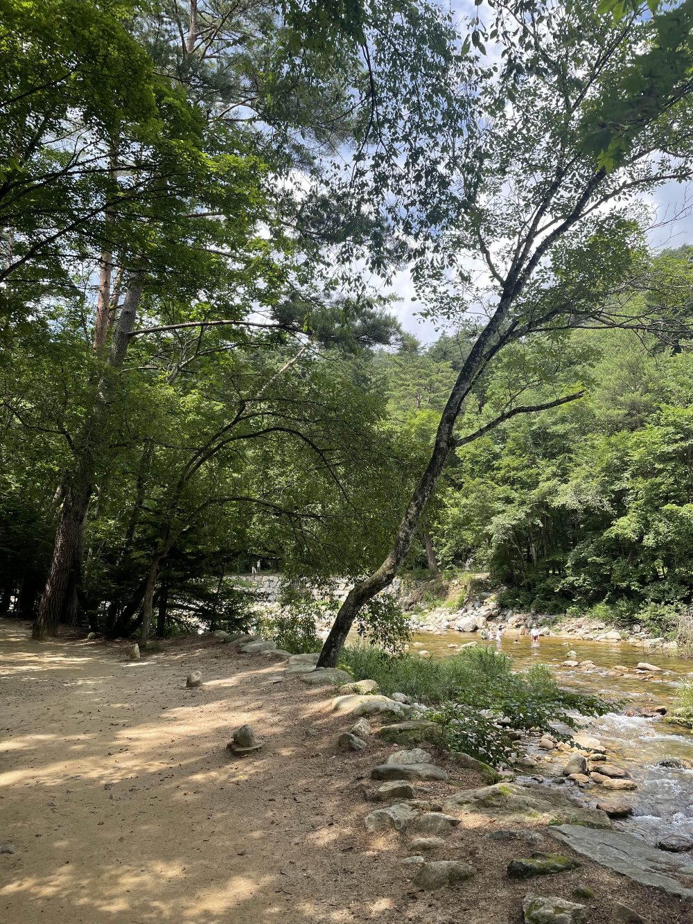 월정사에는 전나무숲을 따라 쭉 산책할 수 있는 길이 있는데요. 옆에는 계곡물이 흐르고 숲이 우거져 있어서 햇볕이 쨍쨍한 날이었지만 산책을 할 수 있었어요. 그늘 덕분에 산책은 할 수 있지만, 걷다보면 땀이 나긴 하더라고요.