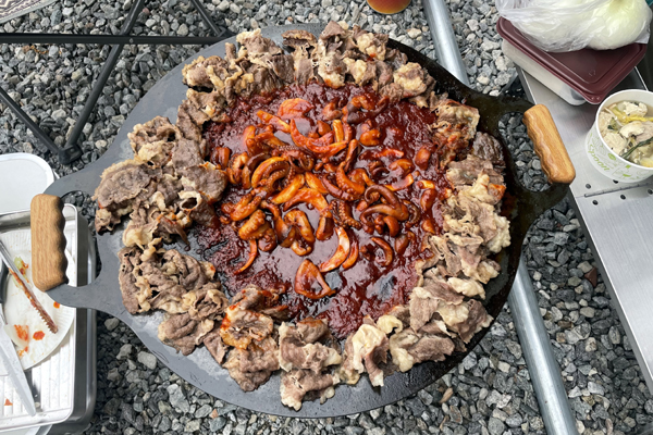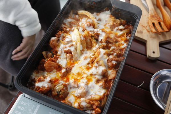 그다음에는 언제 먹어도 맛있는 닭갈비입니다. 닭갈비도 제가 캠핑장에서 자주 해 먹는 캠핑요리 중 하나에요. 물론 제가 직접 양념까지 다 하는 건 아니고요. 시중에 닭갈비 양념까지 되어 있는 제품이 잘 나와 있기 때문에 채소와 치즈 정도를 추가해서 먹는 식으로 만들어 먹고 있습니다.