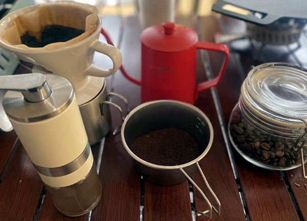 최근에는 커피를 직접 갈아서 내려마시는 데에 꽂혀 있어서 휴대용 그라인더와 커피콩도 전부 들고 다니고 있어요. 캠핑장에서 풍경을 보면서 커피 마시는 게 힐링 시간이거든요. 갈기 귀찮을 때는 드립백을 가지고 가서 내려 마셔도 좋아요.
