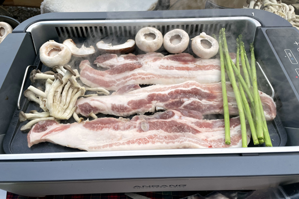 아무리 자주 먹는다고 해도 삼겹살을 빼놓을 수는 없는데요. 요즘에는 버섯, 미나리, 아스파라거스 등 다양한 부재료와 함께 구워 먹으려고 해요. 오른쪽 사진은 캠핑 고수인 친구가 만들어준 쭈꾸미 차돌인데요. 느끼한 고기를 쭈꾸미가 확 잡아줘서 정말 맛있어요. 넓은 그리들에 해먹으면 비주얼도 굿이에요.