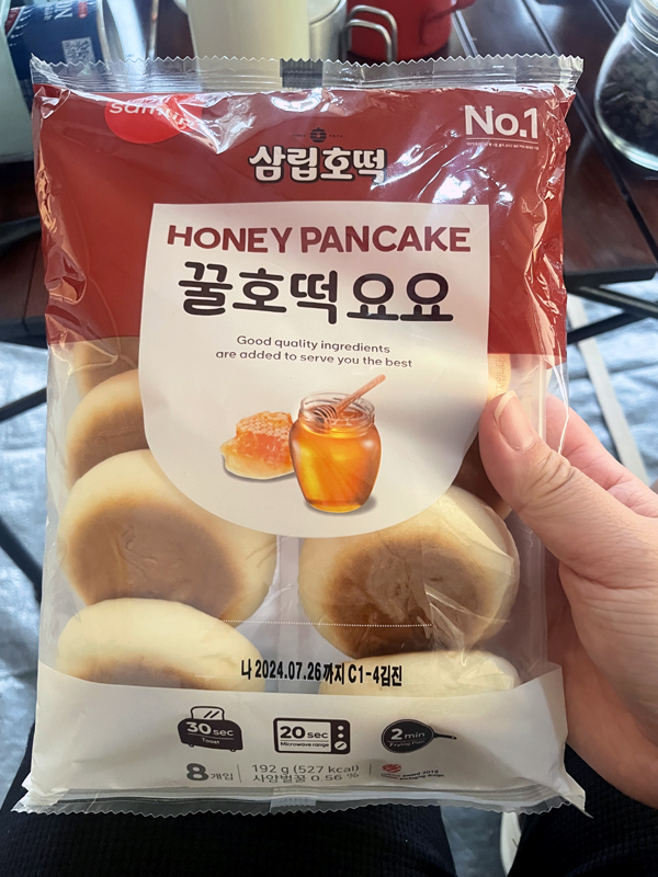 다음으로 제가 좋아하는 간식은 꿀호떡인데요. 그냥 먹으면 별로인데 살짝 구워 먹으면 진짜 맛있어요. 사실 집에서는 잘 안 먹는 음식인데 이상하게 캠핑장에서 먹으면 맛있더라고요.