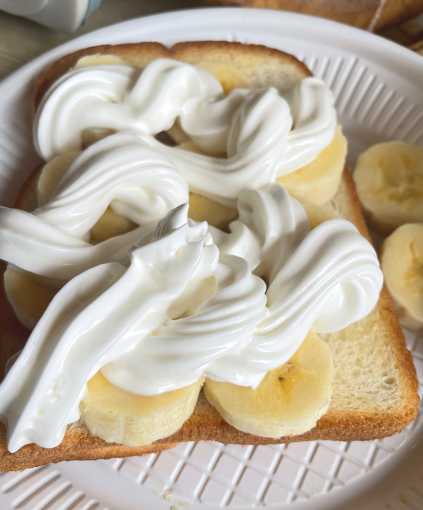 최근에는 아침으로 바나나 토스트를 만들어 보았는데요. 아이들도 좋아하는 메뉴예요. 버터에 식빵을 구워서 바나나를 썰어서 올린 다음 휘핑크림을 올리면 되는데, 휘핑은 스프레이로 준비해 가시면 간편합니다.