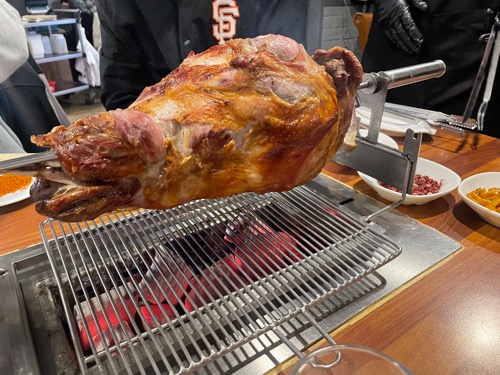 이 집에 가는 이유 중 하나가 바로 이 양다리 때문이기도 한데요. 미리 예약하면 양다리를 이렇게 준비해주시기 때문에 손님을 모시고 종종 가고 있어요. 직접 고기를 잘라 주시기 때문에 먹기도 편해요.