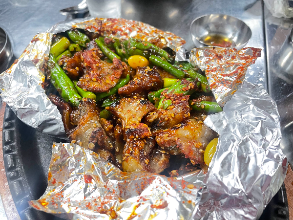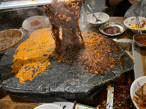 큰 돌판 위에 돼지고기와 김치를 크게 올려 구워서 먹는 건데요.