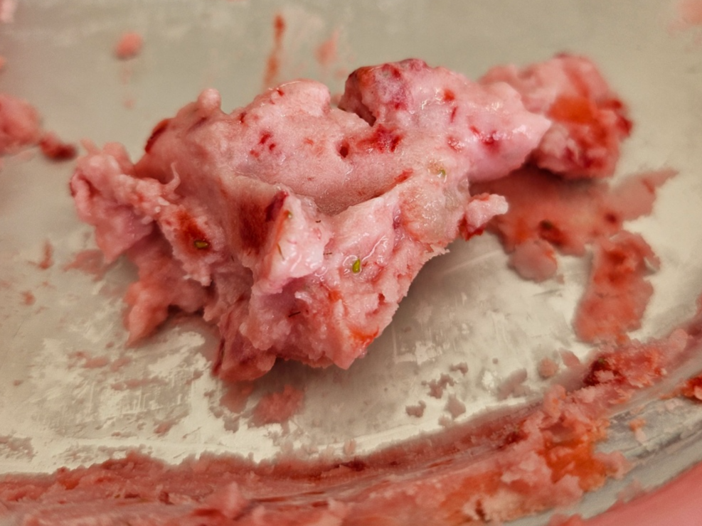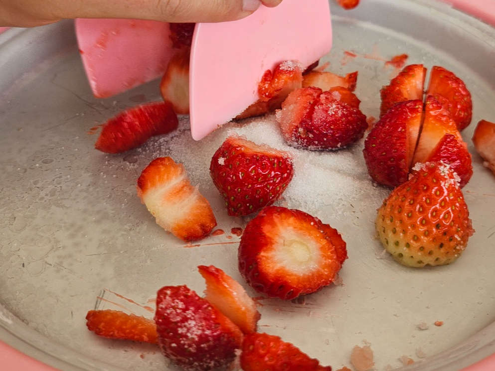 딸기 아이스크림 만들기 체험도 했어요. 딸기에 설탕과 우유를 넣고 차가운 철판 위에서 열심히 섞어주면 아이스크림 완성!