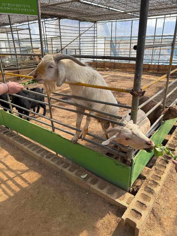 염소 종류가 가장 많았던 것 같아요. 아주 서로 먹겠다고 난리... 못 먹는 아기 염소가 불쌍해서 큰 애들을 옆으로 유인한 다음에 먹이를 주고 그랬어요ㅎㅎ 어린 아이들은 손가락을 조심해야겠더라고요.