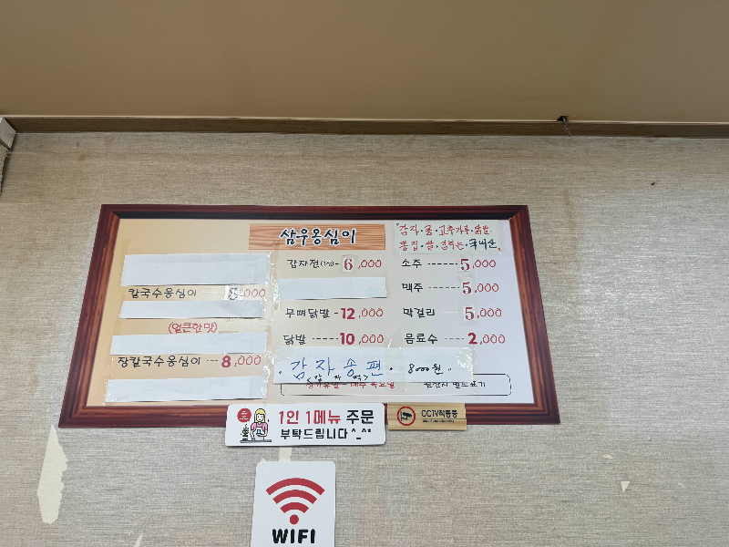 삼우옹심이 메뉴는 칼국수 옹심이, 장칼국수 옹심이, 감자전 그리고 닭발이 있더라고요?ㅎㅎ 안주용인가...