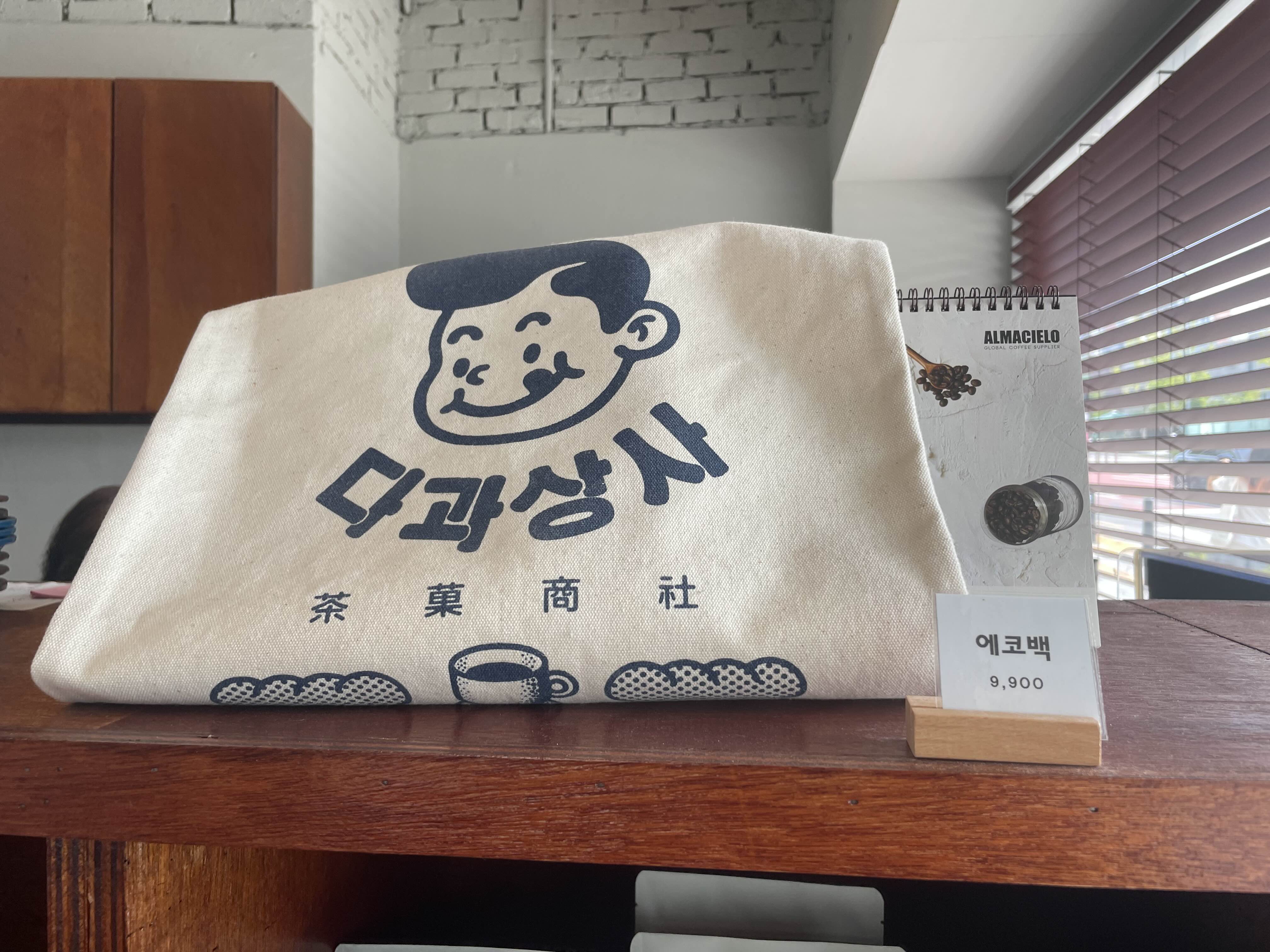 원두와 굿즈도 팔고 있어요. 다과상사는 고유의 디자인이 있어서 그걸 이용한 굿즈를 팔고 있어요.